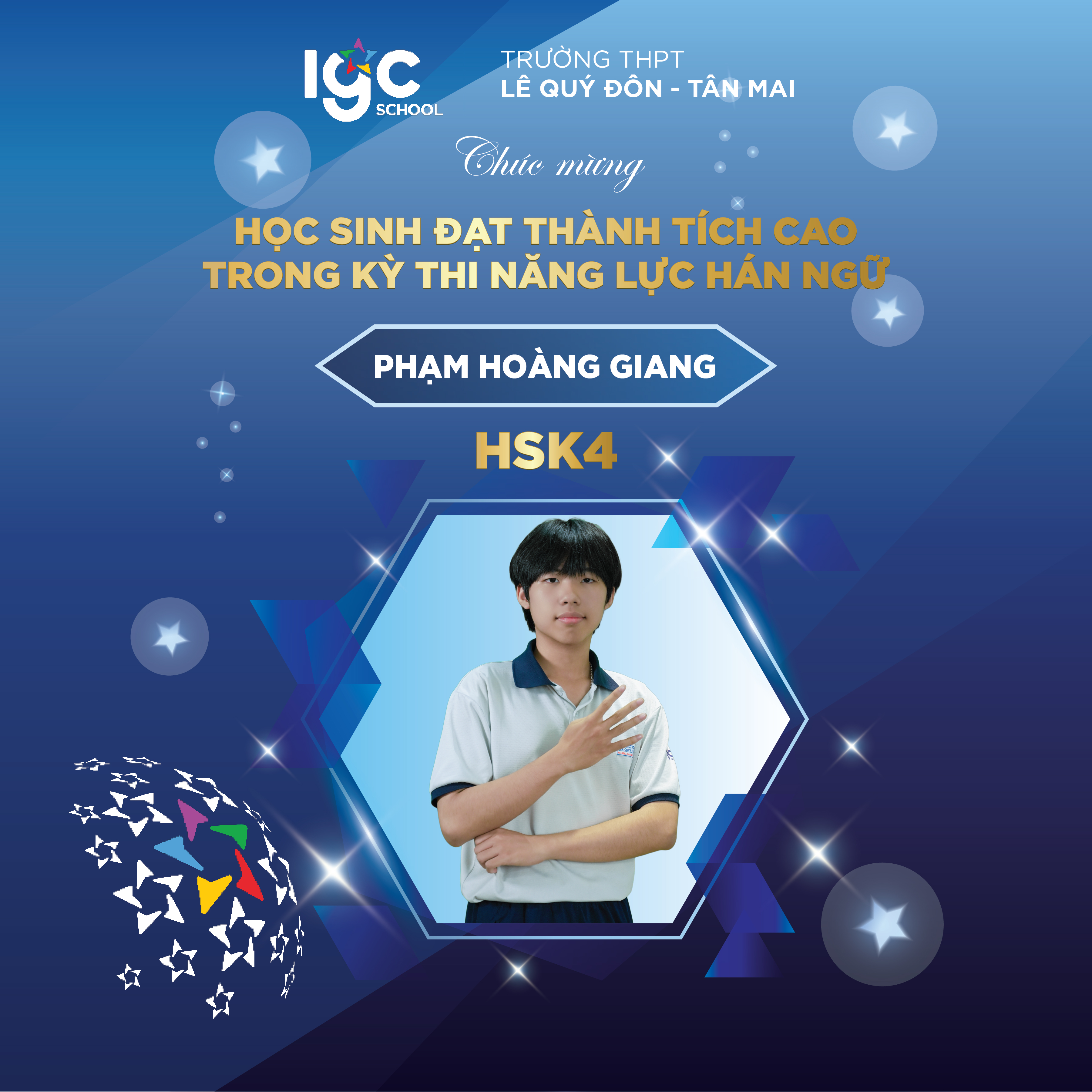 Trường THPT Lê Quý Đôn – Tân Mai chúc mừng em Phạm Hoàng Giang đã xuất sắc đạt thành tích cao trong Kỳ thi Năng lực Hán ngữ đạt HSK 4.